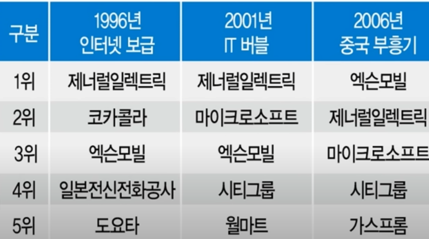 미국을 보더라도 글로벌 시가총액 상위기업, GE 제너럴 일렉트릭이 오랫동안 1등이었습니다. 1996년 인터넷 보급때 2등이 코카콜라. 2001년 IT버블때는 1등이 제너럴일렉트릭, 2등이 마이크로소프트. 2006년에는 엑슨모빌이 1등이고 제너럴일렉트릭이 2등, 마이크로소프트가 3등입니다. 그 다음부터는 계속 애플이 1등입니다. 사우디 아람코는 제외하고 우리가 투자할 수는 없으니까. 아마존, 알파벳 이렇게 세월이 가면서 계속 바뀝니다.