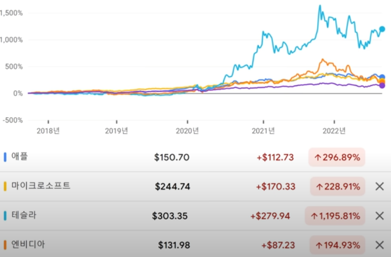 예를들어, 빅테크. 애플, 마이크로소프트, 테슬라, 엔비디아의 5년간 수익률을 보면 100%가 두배죠? 다 두배 이상입니다. 테슬라는 수익률이 10배 이상입니다. 타이거 나스닥 100 ETF가 가장 수익률이 낮습니다. 이런걸 보면 개별종목에 투자하는게 낫겠네요? 당연히 낫죠 보면은. 그러나, 과거부터 지금까지 보면 이 시가총액 상위 종목들은 계속, 역사적으로 바뀌어 왔습니다.