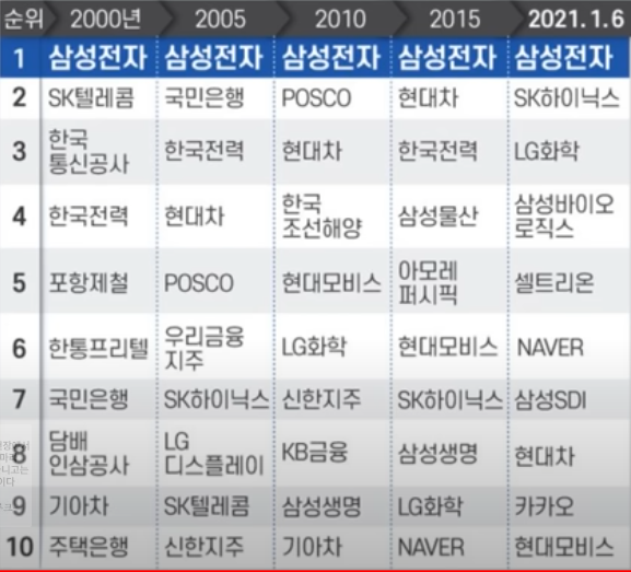 우리나라 보면은 삼성전자가 오랫동안 1등입니다. 그것도 2000년대 들어와서 1등이었습니다. 1960년대 중반때만 해도 삼성전자가 3, 4등 했었습니다. 그때 1등이 한국전력, 2등이 포스코 이러한 종목들 이었습니다. 지금은 2000년부터 2021년 작년까지 1등은 변함없이 삼성전자입니다. 그 다음은 셀트리온, 네이버, lg화학, 한국전력, 포스코, 국민은행 이런 종목들입니다. 이런 종목들을 구글에 가서 주식 그래프를 검색해서 기간을 최대로 한번 늘려 보세요. 최대 기간으로 보면 2010년부터, 그러면 12년간이죠 지금이 2022년 이니까. 12년간 얼마만큼 주가가 상승했는지 확인 해 보세요.