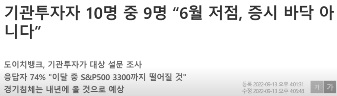 또한 국내에도 기관투자자들이 많이 있습니다만, 미국의 기과투자자들. 미국의 월가에 있다고 하면 정말 세계적으로 인정하는 아닙니까. 그 사람들이 하는 얘기는 6월 저점은 증시바닥이 아니라는 말을 하고 있습니다. 그렇다면 CFRA리서치 수석 전략가는 6월 16일 증시 저점이 바닥임을 시사한다고 했는데 기관투자자들은 그 때 보다 더 내려간다는 말을 하고 있습니다.